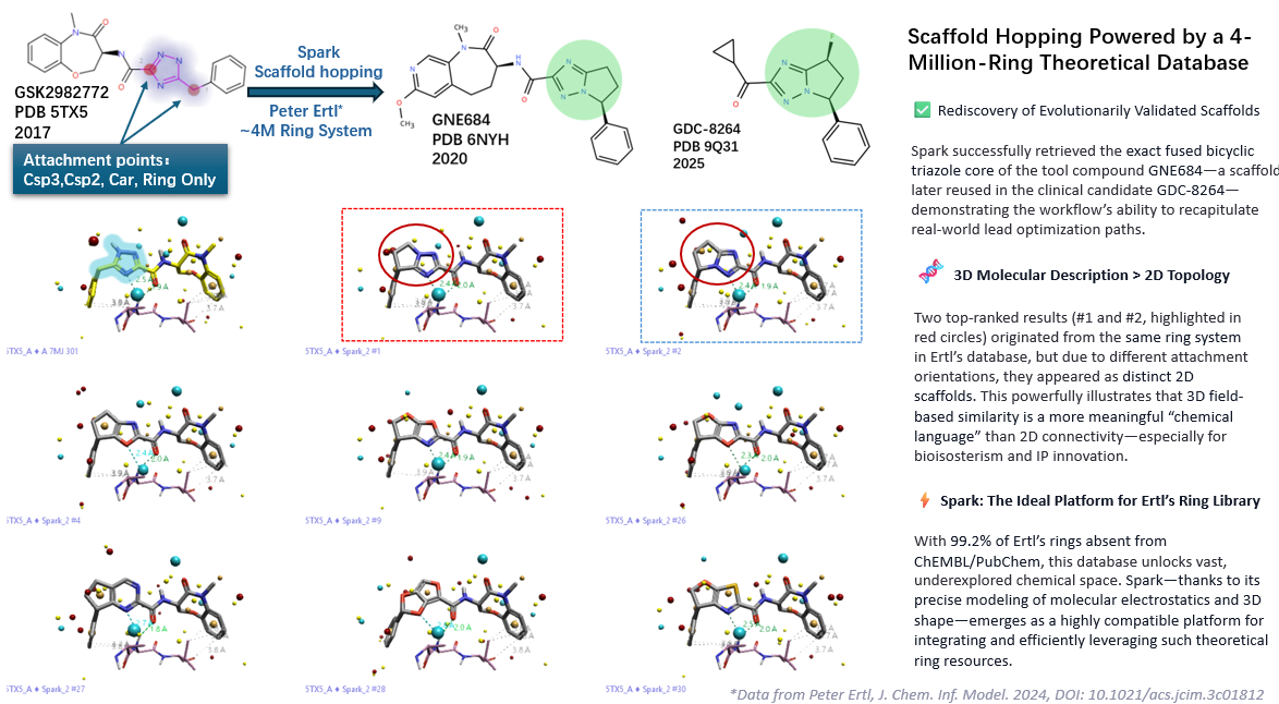 摘要:骨架跃迁是先导化合物优化中的核心策略,其成功在很大程度上依赖于高质量、结构多样的替换片段库。本文将 Peter Ertl 团队于 2024 年发布的包含近 400 万药物化学合理环系的理论数据库整合至 Cresset Spark 的静电–形状驱动骨架跃迁流程中,并以 RIPK1 抑制剂 GSK2982772 为起点分子,对其三氮唑甲基片段进行回溯性替换实验。结果表明,在仅筛选 4,311 个理化性质匹配的环系子集后,Spark 不仅高置信度地重现了后续优化中关键分子——包括工具化合物 GNE684 与临床 II 期候选药物 GDC-8264——所采用的关键双环骨架,还生成了数百个结构新颖、三维形状与静电场高度相似、且能维持与 Asp156 残基关键氢键相互作用的替代方案。本研究证实,基于生物活性分子统计规律生成的理论环系库可显著拓展骨架跃迁的化学探索边界,在保持药效特征的同时注入结构新颖性,为突破现有专利限制和加速先导化合物优化提供有力支持。